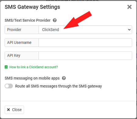 From the options on the popup select ClickSend as your own SMS gateway. Enter API Username and API Key from your ClickSend account.